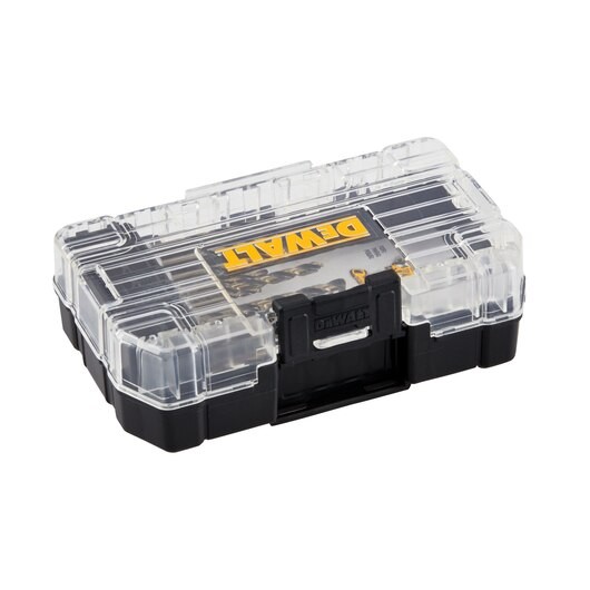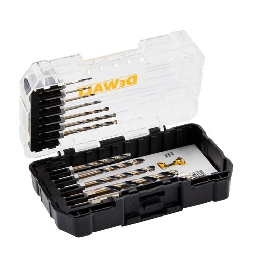 The 12 pc. BLACK & GOLD IMPACT READY® Metal Drill Bit Set is rust-resistant, with a strong tapered core design that helps resist breakage. Made of heavy-duty, high-speed steel for drilling into a variety of materials including plastic, wood, and metal, each bit features a 1/4 in. hex shank designed to resist axial torque with impact drivers. The 135° split point tip design on 1/8 in. and larger sizes helps reduce walking. The 12 pc. set comes in a durable ToughCase®+ system which is designed to optimize storage space and keep your bits organized. The patented bit-bar design allows for easy bit removal, with a clear lid so you can see what"s inside at a glance.